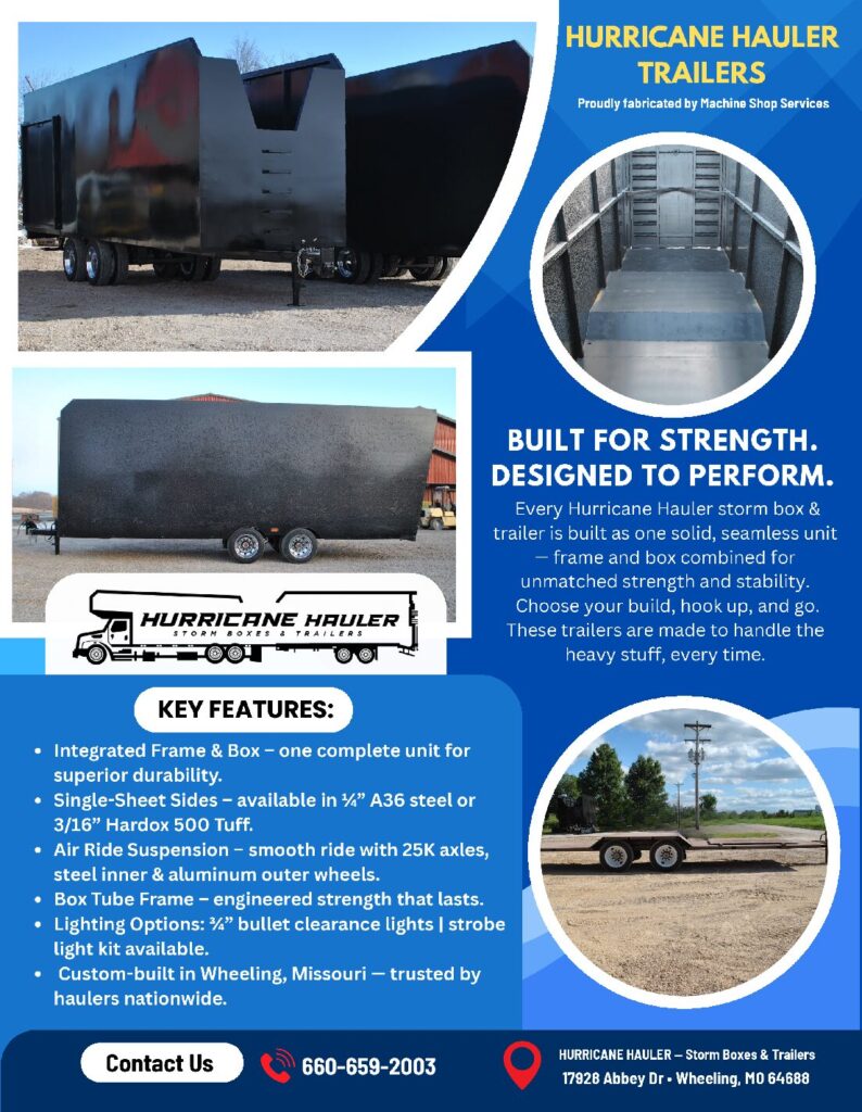 Hurricane Hauler is built on years of hands-on fabrication experience through Machine Shop Services, a trusted local shop serving the area with custom metal work and repairs. The team saw a need for storm boxes and trailers that were built tougher, lasted longer, and fit right — and Hurricane Hauler was born. Every unit is built as one seamless piece, with the frame and box combined for added strength and stability.
