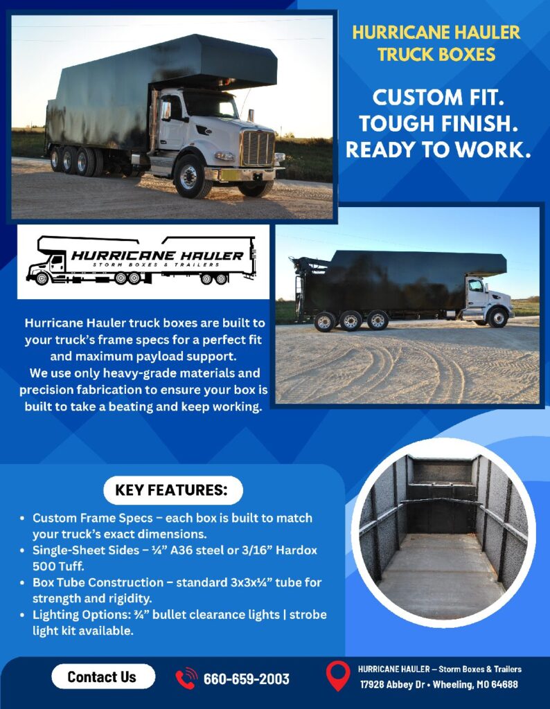 Hurricane Hauler is a Midwest-based builder of heavy-duty storm boxes, truck boxes, and trailers, proudly fabricated in Wheeling, Missouri. Known for their solid construction and dependable performance, Hurricane Hauler builds equipment designed for people who work hard and need their gear to keep up.